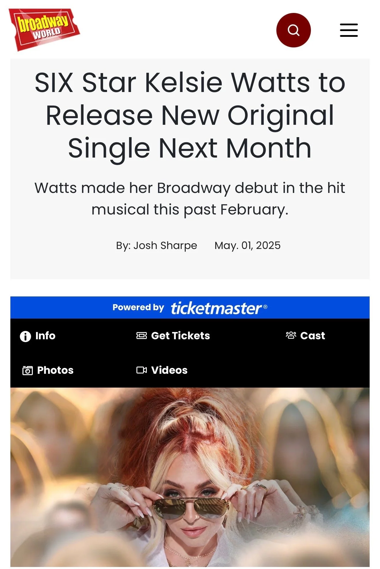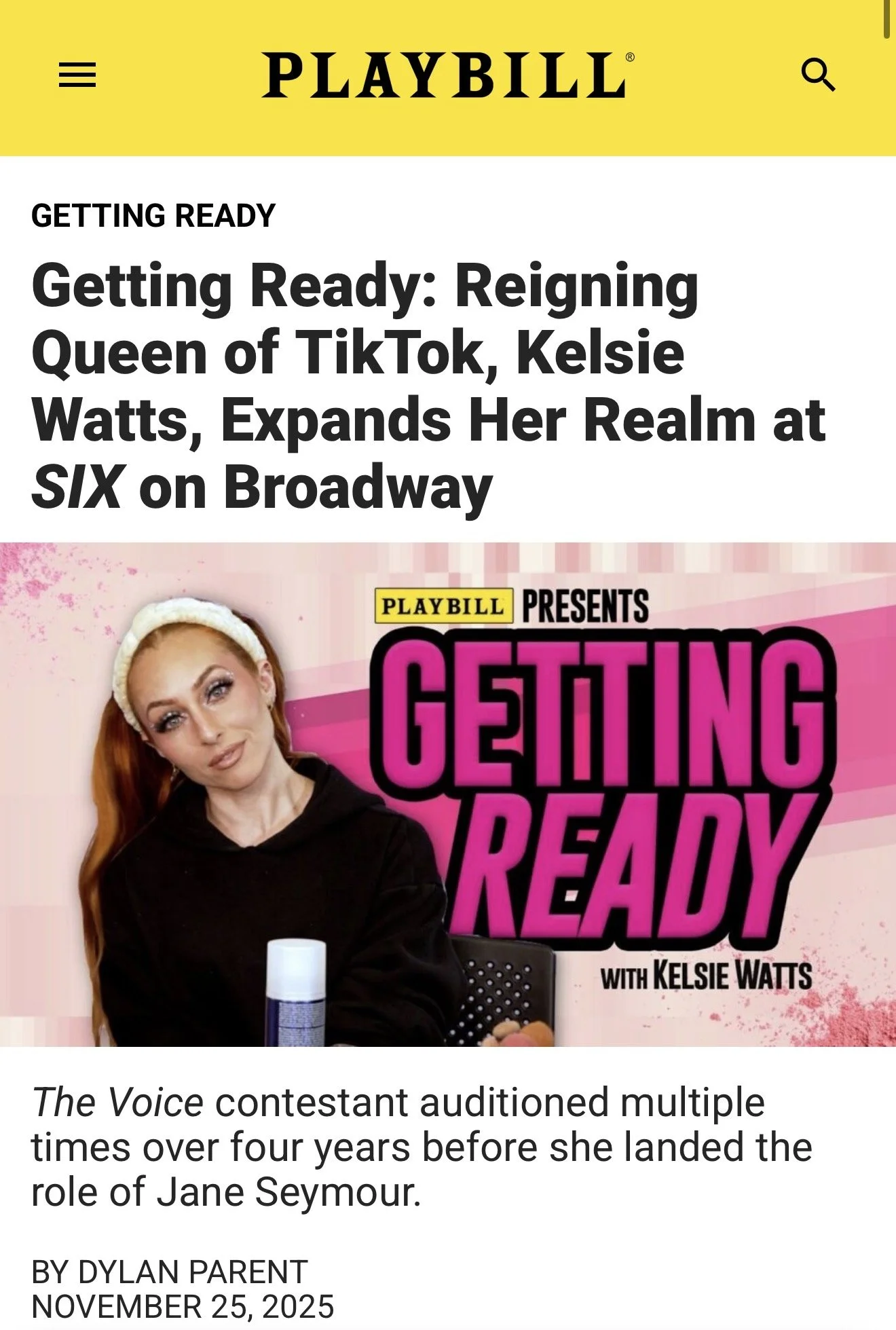 In 2025, Kelsie made her Broadway debut in SIX the Musical as Jane Seymour. While performing, she continued to release new music, walk and perform in NYFW, collaborate with brands like Maybelline, and give back at charity events such as VETS. For the holiday season, Watts released “Christmas in New York,” a nostalgic love letter to the magic of the Big Apple at Christmastime that was featured on “LIVE with Kelly and Mark.” In celebration of the release, she performed at several iconic Christmas events, including NYSE Treelighting, Tavern on the Green Treelighting, Washington Square Treelighting and the Lighting of the Iconic Vessel.